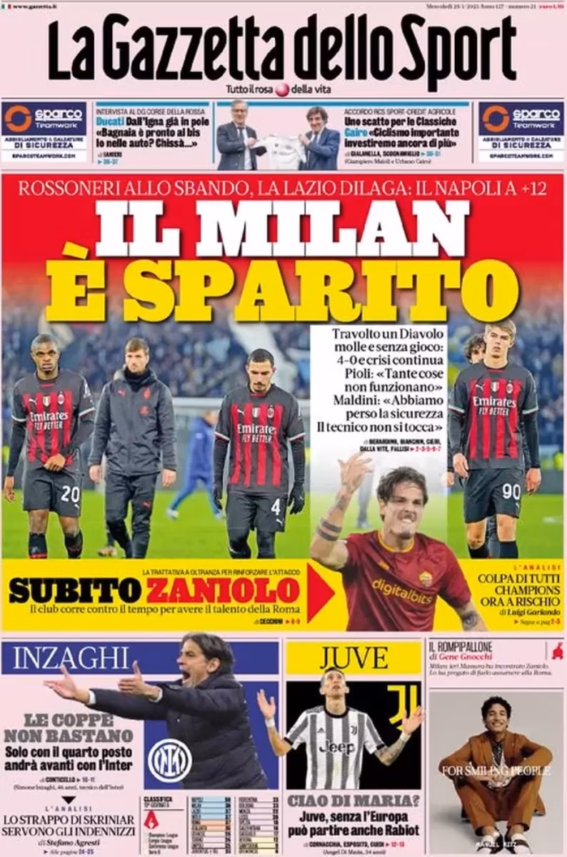 Con la partita tra Lazio e Milan si è concluso il girone di andata di Serie A. A dominare la classifica è il Napoli di Spalletti con ben 12 punti di vantaggio sulla seconda. Seguono Milan (38), Lazio, Inter, Roma (37) e Atalanta (35).