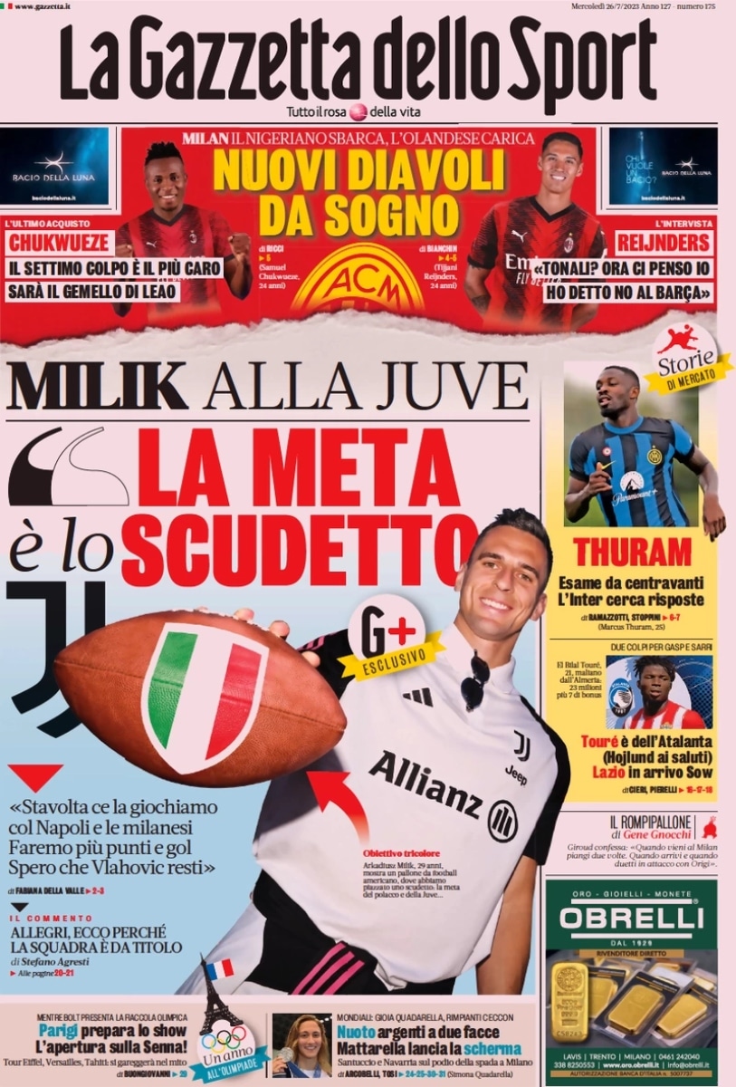 La Gazzetta dello Sport in edicola oggi apre in prima pagina con un’intervista esclusiva a Milik: “La meta è lo scudetto”. L’attaccante polacco non ha dubbi: “Stavolta ce la giochiamo con il Napoli e le milanesi. Faremo più punti e gol, spero che Vlahovic resti”.