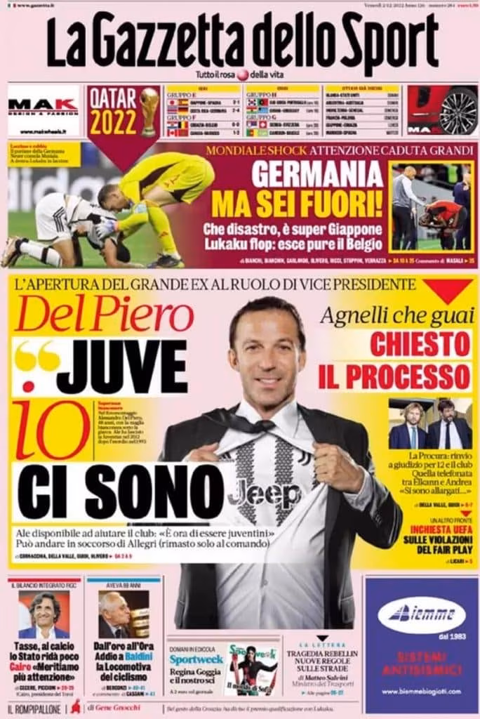 Nel frattempo il caos in casa Juve continua. Dopo le dimissioni del presidente Agnelli e tutto il Cda, la Procura ieri ha chiesto il rinvio a giudizio per 12 persone.