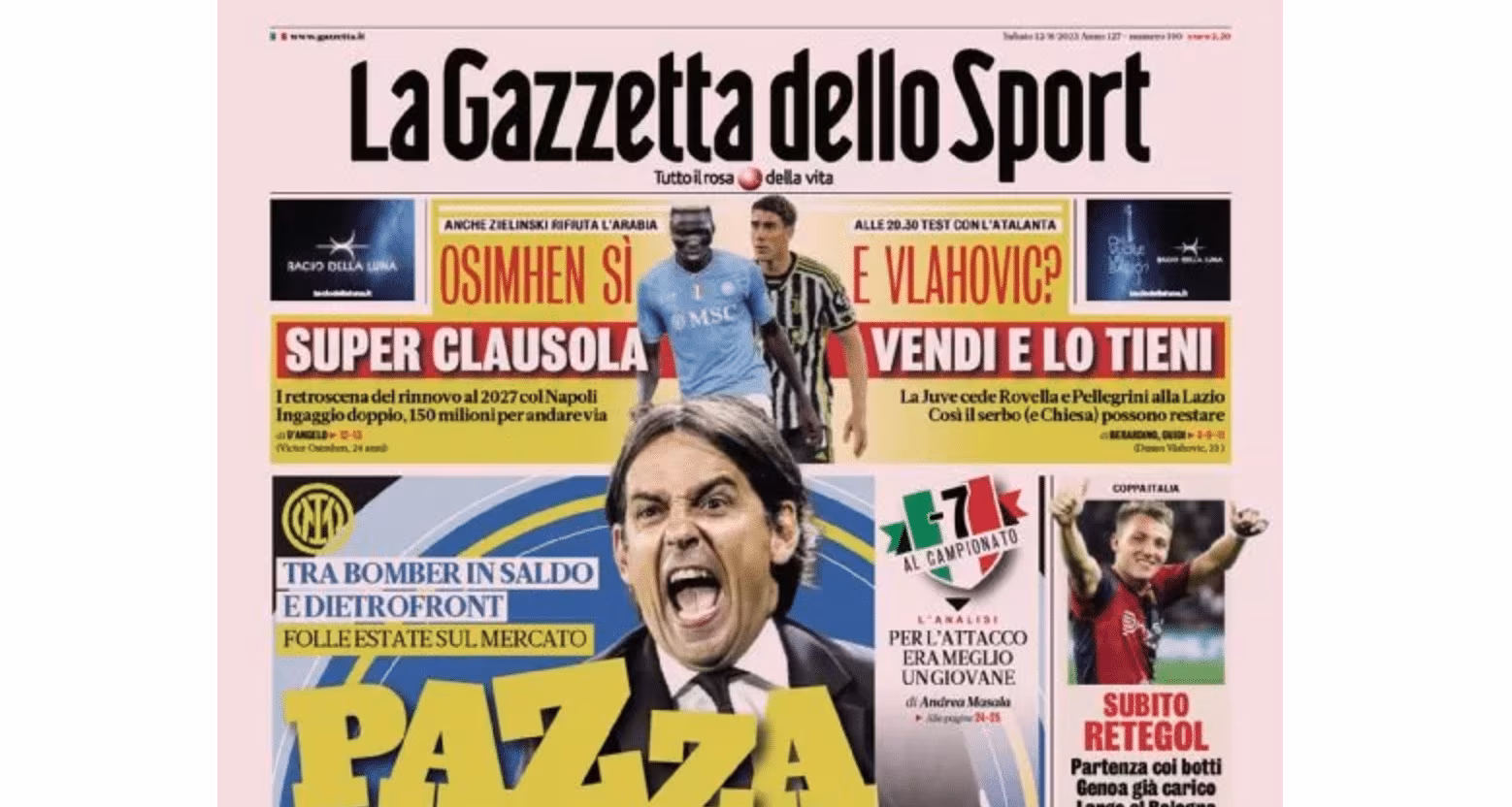 “Alle 20.30 test con l’Atalanta”. Questa l’apertura de La Gazzetta dello Sport, che dedica la parte alta della sua prima pagina a Vlahovic e alla partita amichevole di questa sera. “La Juve cede Rovella e Pellegrini alla Lazio. Così il serbo (e Chiesa) possono restare” continua la rosea, che parla dei movimenti di mercato dei bianconeri.