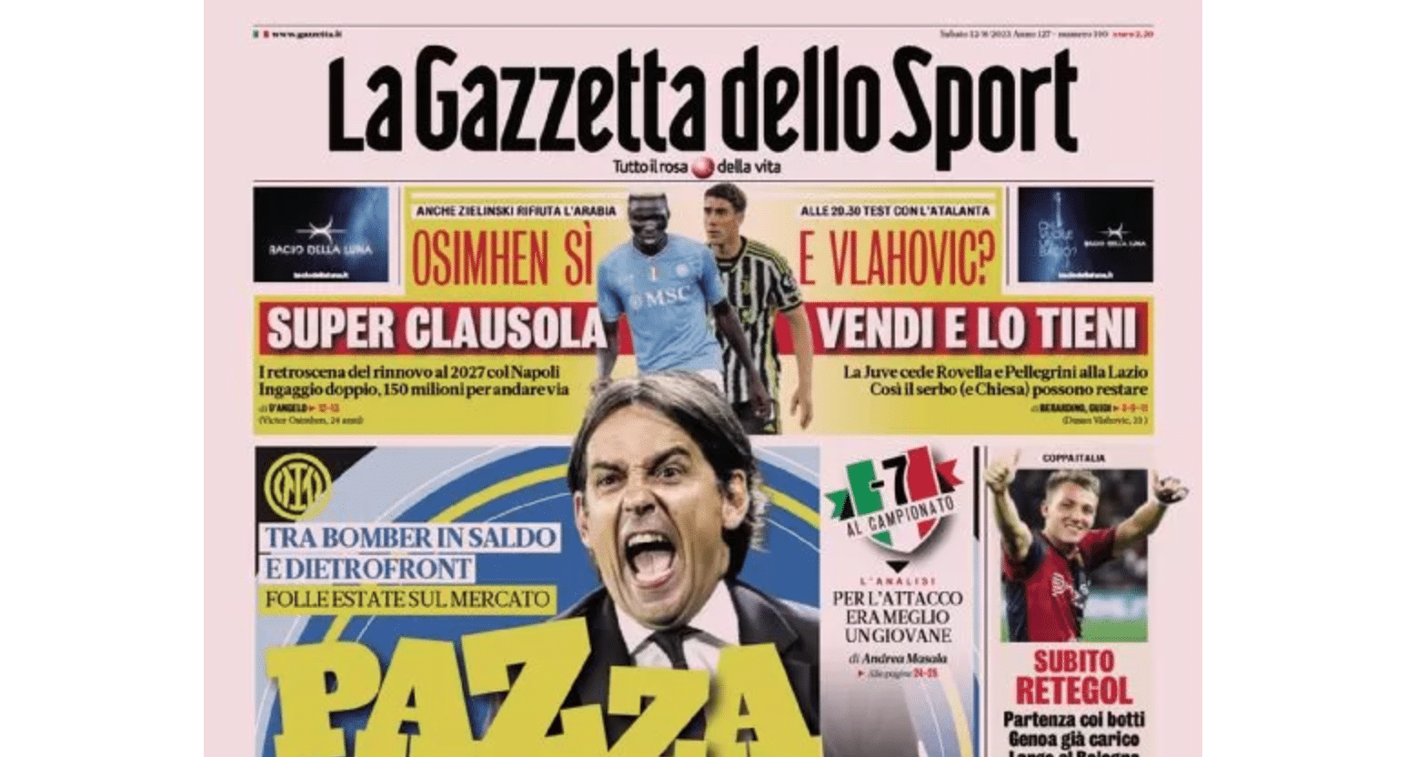 “Alle 20.30 test con l’Atalanta”. Questa l’apertura de La Gazzetta dello Sport, che dedica la parte alta della sua prima pagina a Vlahovic e alla partita amichevole di questa sera. “La Juve cede Rovella e Pellegrini alla Lazio. Così il serbo (e Chiesa) possono restare” continua la rosea, che parla dei movimenti di mercato dei bianconeri.