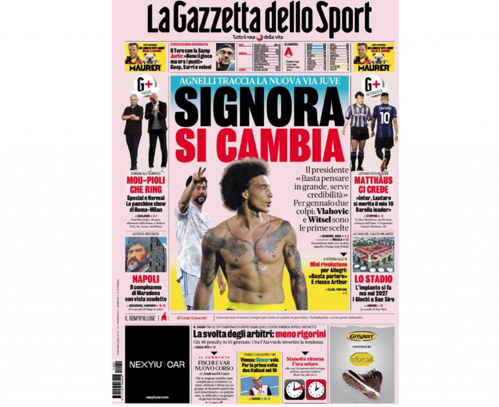 La rosea apre con la prima pagina dedicata alla Juventus nella parte centrale: “Signora si cambia. Agnelli tranvia la nuova via Juve. Il presidente: “Basta pensare in grande, ci serve credibilità”. Per gennaio due colpi: Vlahovic e Witsel sono le prime scelte”. Tagli laterali dedicati alle due milanesi e alle partite che le aspettano.