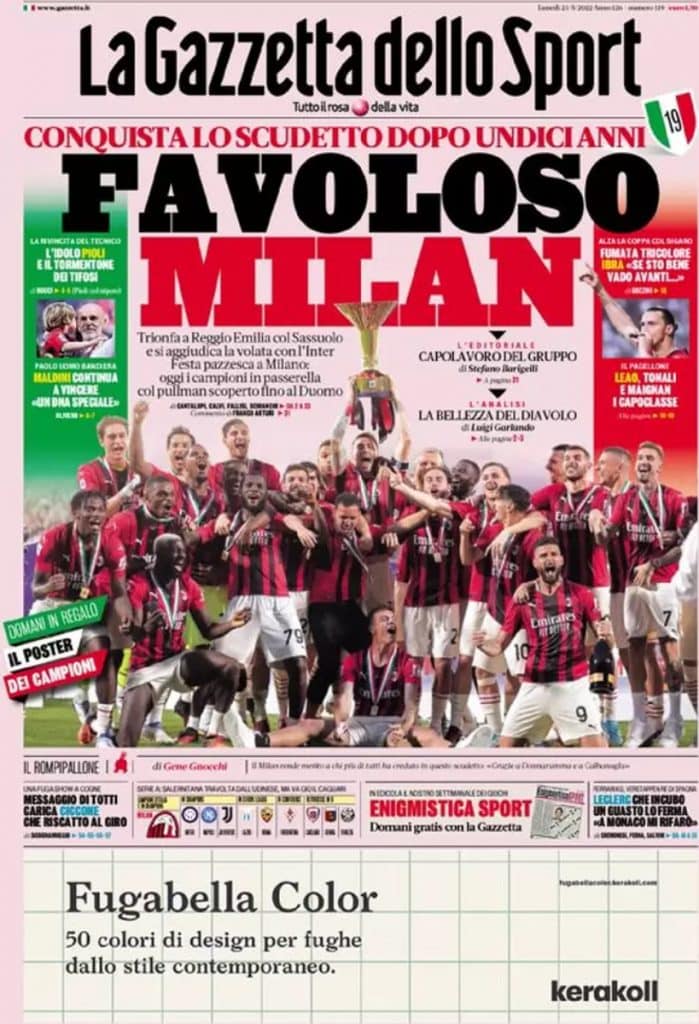 Da La Gazzetta dello Sport fino a Il Corriere dello Sport, tutte le prime pagine dei quotidiani sportivi rendono oggi omaggio al Milan di Stefano Pioli, laureatosi ieri Campione d’Italia.