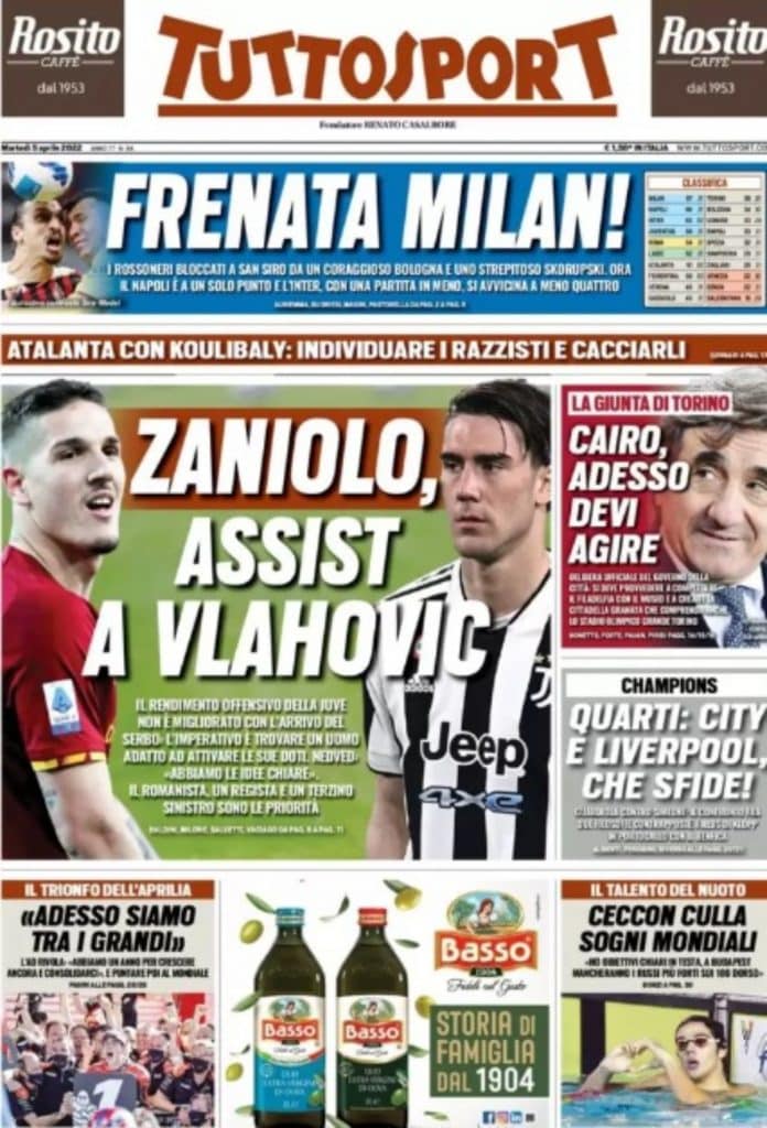 Oggi TuttoSport titola “Zaniolo, assist a Vlahovic“. Il talento giallorosso sembra l’uomo giusto individuato dalla dirigenza bianconera per aiutare il centravanti serbo nella prossima stagione. Un giocatore fisico e veloce, che possa portare via le marcature al compagno e dialogare con lui.