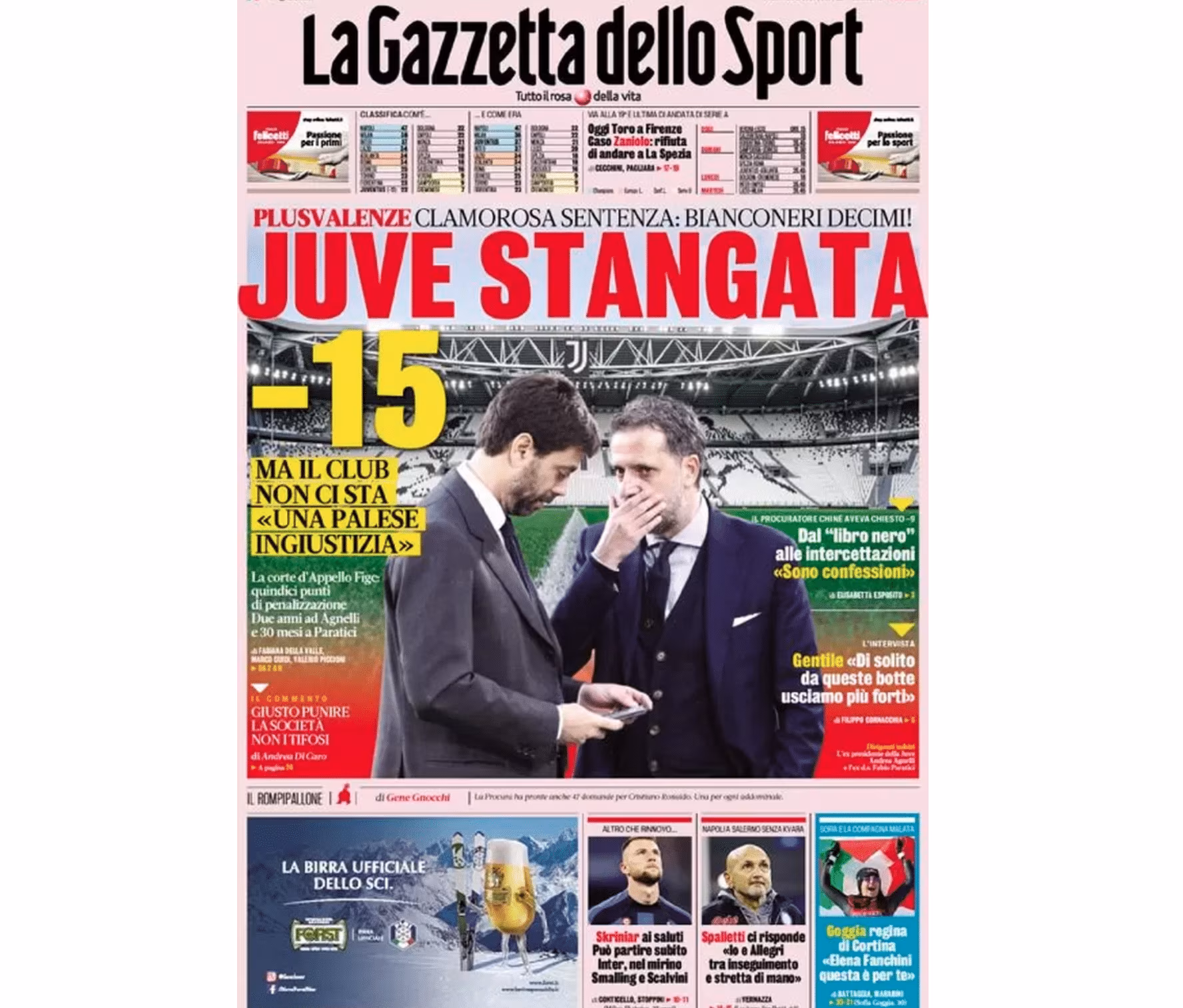 La squadra bianconera ha subito ieri sera la decisione della Corte di Appello del CONI, che ha inflitto quindici punti di penalizzazione ai bianconeri.