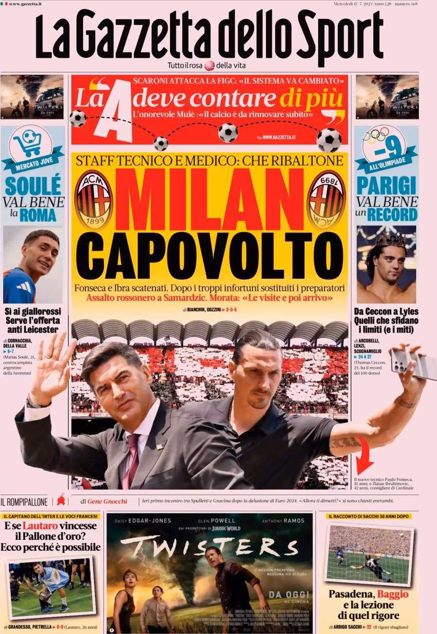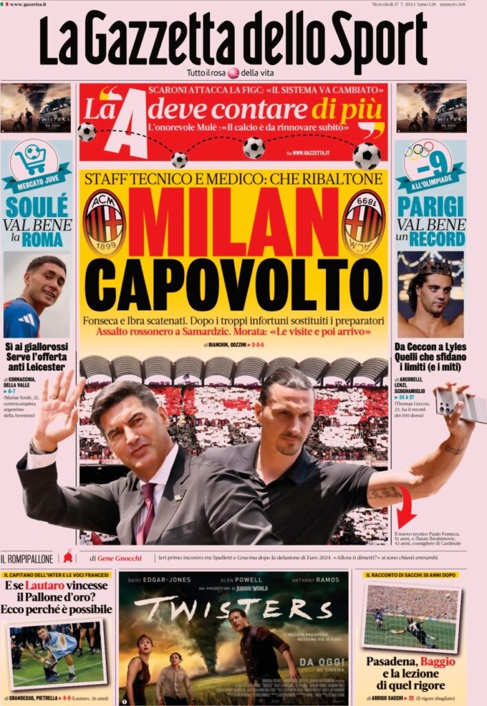 La Gazzetta dello Sport titola: “Milan capovolto”. In taglio alto: “La A deve contare di più”. Ai lati: “Soulè va bene la Roma” e “Parigi val bene un record”. In taglio basso: “E se Lautaro vincesse il Pallone d’Oro? Ecco perchè è possibile” e “Pasadena, Baggio e la lezione di quel rigore”.