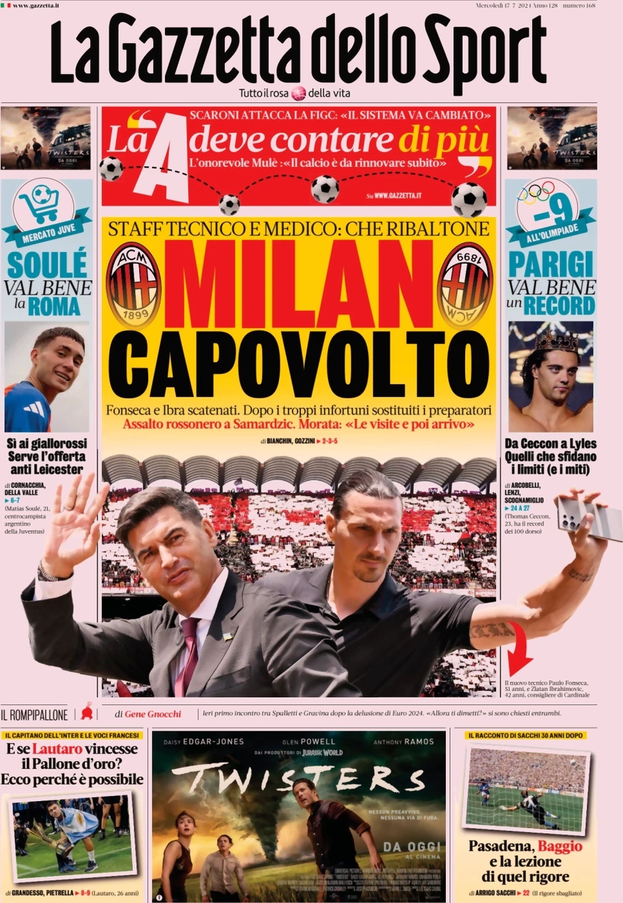 La Gazzetta dello Sport titola: “Milan capovolto”. In taglio alto: “La A deve contare di più”. Ai lati: “Soulè va bene la Roma” e “Parigi val bene un record”. In taglio basso: “E se Lautaro vincesse il Pallone d’Oro? Ecco perchè è possibile” e “Pasadena, Baggio e la lezione di quel rigore”.