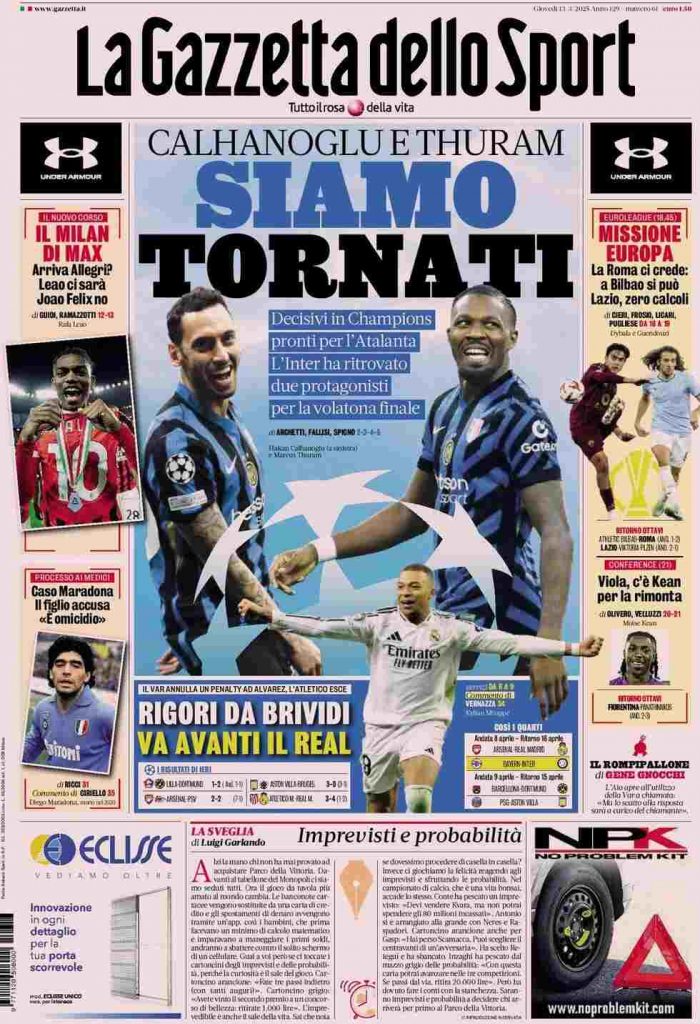 La Gazzetta dello Sport titola: “Siamo tornati. Calhanoglu e Thuram decisivi in Champions, pronti per l’Atalanta. L’Inter ha ritrovato due protagonisti per la volatona finale”. A lato: “Il Milan di Max”, “Caso Maradona. Il figlio accusa: È omicidio”, “Missione Europa” e “Viola, c’è Kean per la rimonta”. In basso: “Rigori da brividi. Va avanti il Real”.