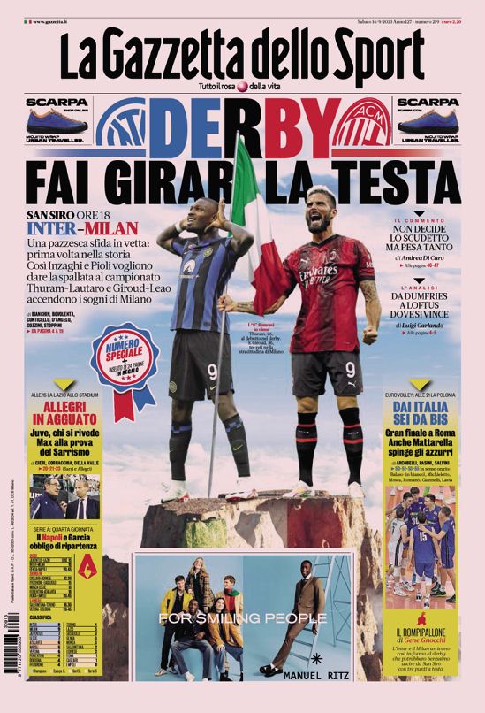 In prima pagina ampio spazio al big match di oggi a San Siro, con: “Derby, fai girare la testa”. Su Juve-Lazio: “Allegri in agguato“.