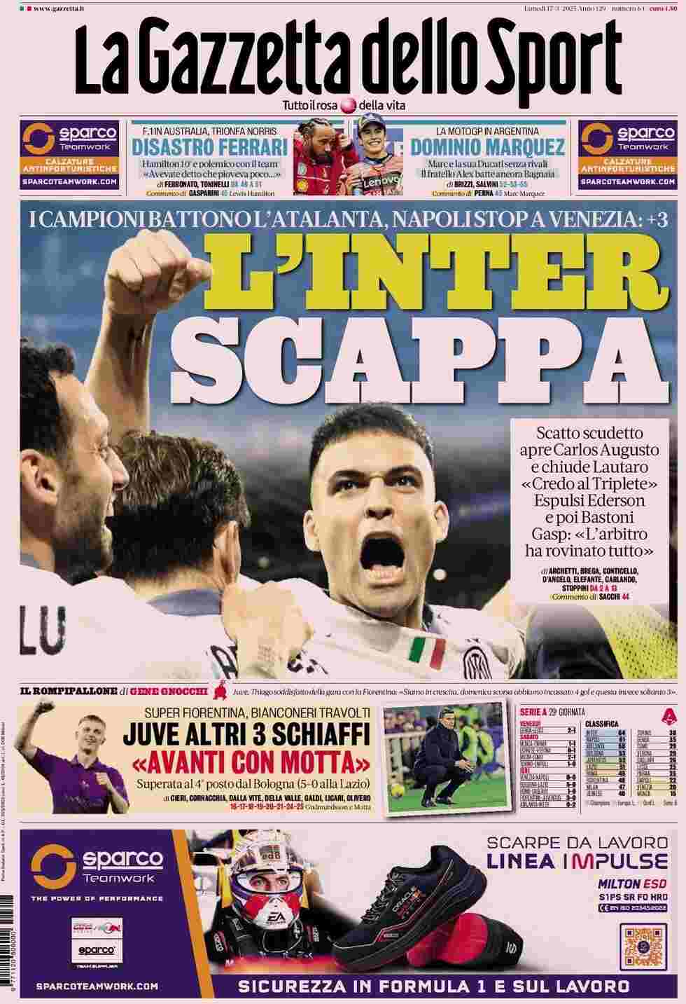 La Gazzetta dello Sport apre con la vittoria dei nerazzurri contro l’Atalanta: “L’Inter scappa. I campioni battono l’Atalanta. Napoli stop a Venezia: +3”. In alto: “Disastro Ferrari” e “Dominio Marquez”. In basso: “Juve altri 3 schiaffi: Avanti con Motta”. E poi ancora: “Superata al 4o posto dal Bologna (5-0 alla Lazio)”.