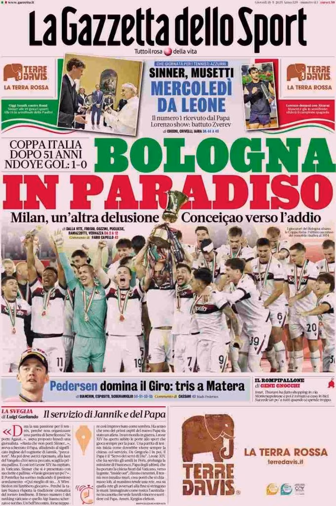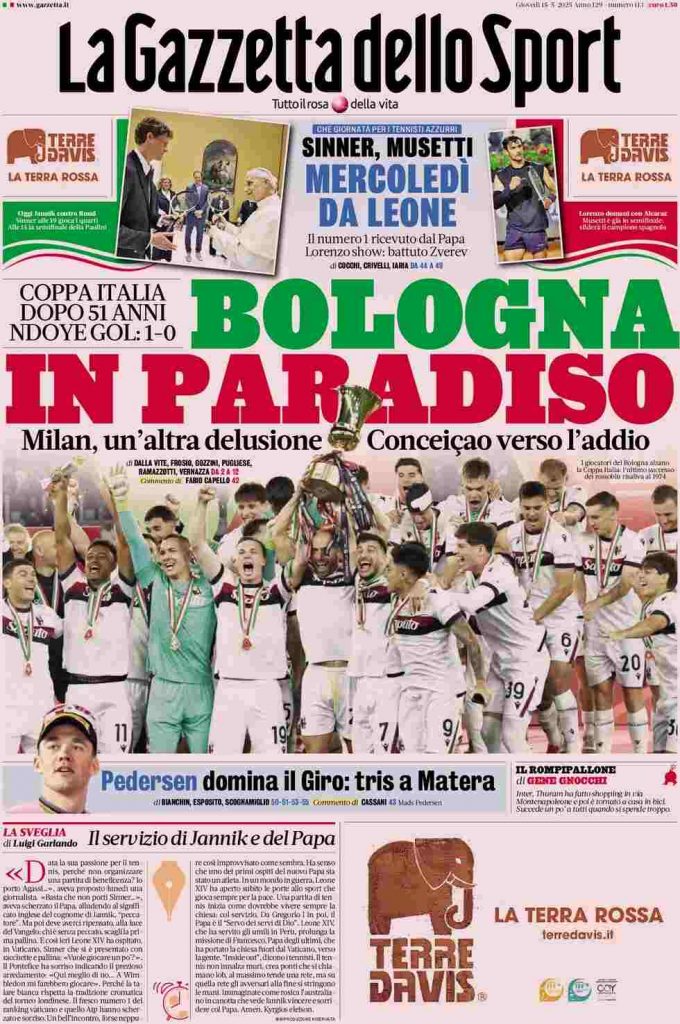 La Gazzetta dello Sport titola: “Bologna in paradiso”. E ancora: “Milan, un’altra delusione. Conceiçao verso l’addio”. In alto: “Sinner, Musetti. Mercoledì da Leone”. In taglio basso: “Pedersen domina il Giro: tris a Matera”.