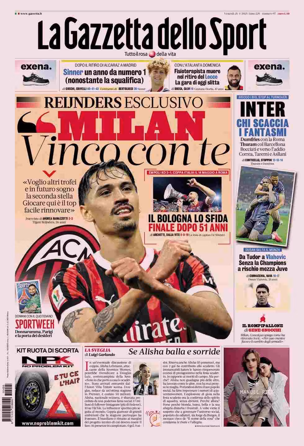 La Gazzetta dello Sport apre con un’intervista esclusiva a Reijnders: “Milan vinco con te”. Sotto: “Il Bologna lo sfida, finale dopo 51 anni”. In alto: “Sinner un anno da numero 1 (nonostante la squalifica)” e “Fisioterapista muore nel ritiro del Lecce. La gara di oggi slitta”. A lato: “Inter, chi scaccia i fantasmi” e “Da Tudor a Vlahovic. Senza Champions a rischio mezza Juve“.