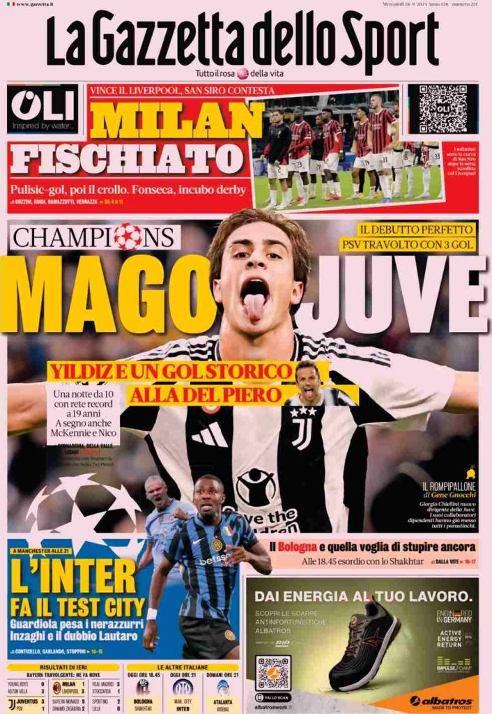 “Mago Juve”, questo il titolo de La Gazzetta dello Sport che apre con il gol di Yildiz in Champions League. E ancora: “Il debutto perfetto. PSV travolto con 3 gol. Yildiz un gol storico alla Del Piero”. In taglio alto: “Milan fischiato”. In basso: “L’Inter fa il test City” e “Il Bologna e quella voglia di stupire ancora”.