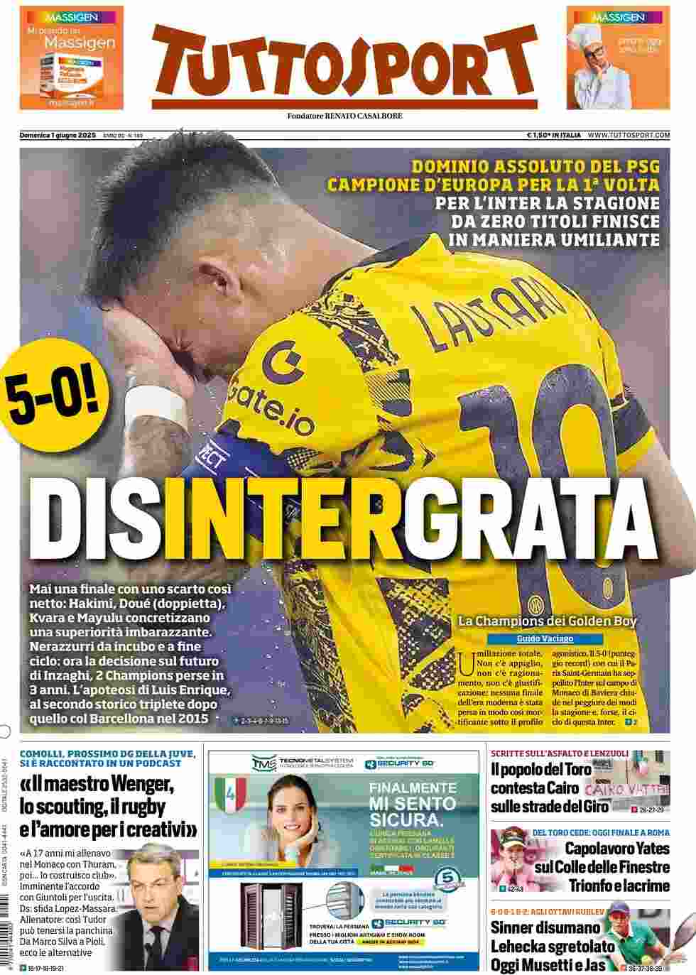 “DisINTERgrata”, questo il titolo di Tuttosport. In basso le parole del prossimo dg della Juve Comolli: “Il Maestro Wenger, lo Scouting, il rugby e l’amore per i creativi”, “Il popolo del Toro contesta Cairo sulle strade del Giro”, “Capolavoro Yates sul Colle della Finestra. Trionfo e lacrime” e “Sinner disumano. Lehecka sgretolato. Oggi Musetti e Jas”.