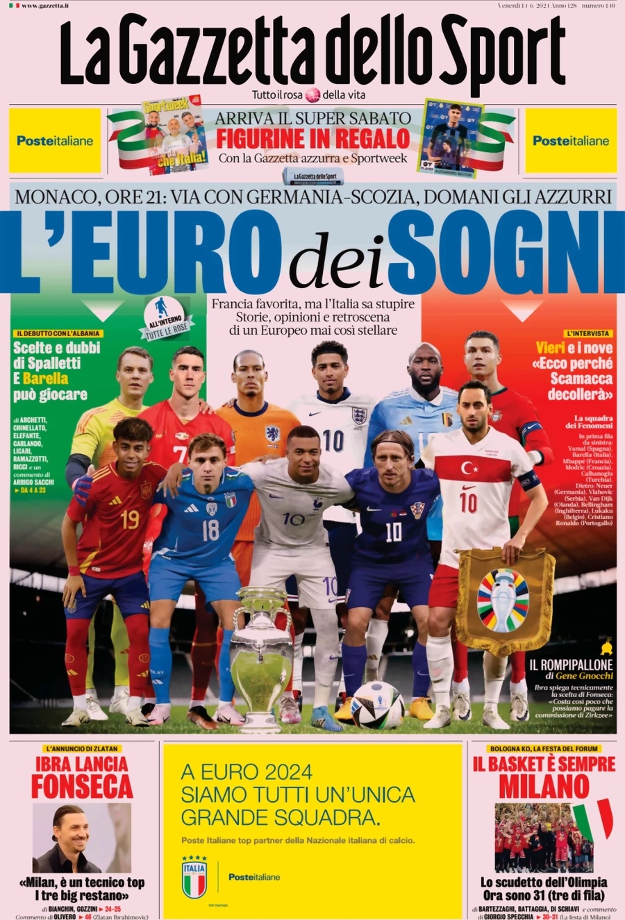 La Gazzetta dello Sport apre con l’Europeo: “L’Euro dei sogni”. In basso: “Ibra lancia Fonseca” e “Il basket è sempre Milano”.