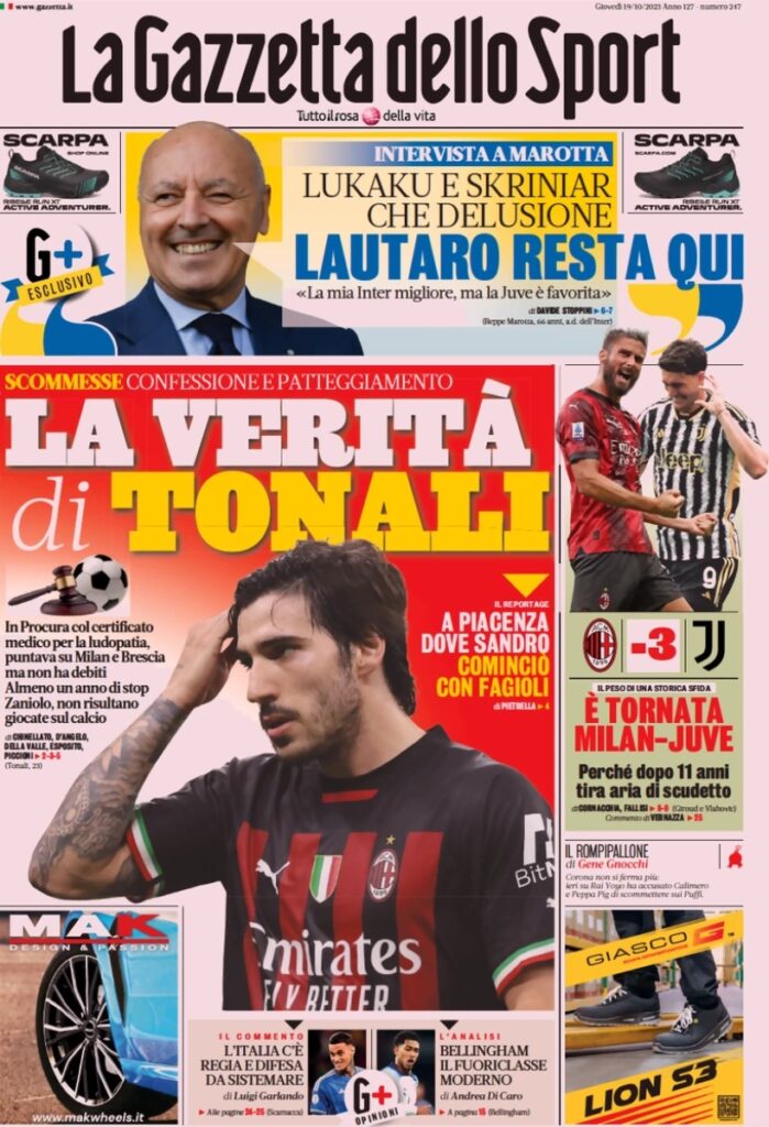 La Gazzetta dello Sport apre in prima pagina con il caso scommesse: “La verità di Tonali”. In taglio alto un’intervista esclusiva a Marotta: “Lukaku e Skriniar che delusione. La mia Inter migliore, ma la Juve è favorita”. A lato il conto alla rovescia per il ritorno in campo dei bianconeri: “È tornata Milan-Juve”.