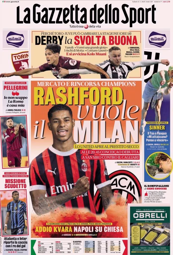 La Gazzetta dello Sport apre con il mercato rossonero: “Rashford vuole il Milan. Mercato e rincorsa Champions”. In taglio alto: “Derby, la svolta buona. Perchè Toro-Juve può cambiare la stagione”. E ancora: “E si avvicina Kolo Muani”. A lato: “Pellegrini: Io non scappo. La Roma casa mia“, “Missione scudetto. Atalanta e Inter riparte la ciaccia con i re del gol” e “Sinner. Il Tas a Pasqua: Mi attaccano? Penso a vincere”. In basso: “Addio Kvara, Napoli su Chiesa”.