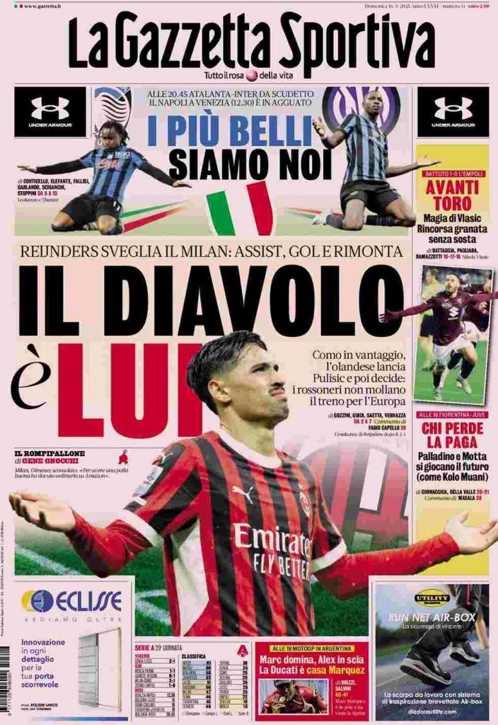 La Gazzetta dello Sport apre con la vittoria in rimonta del Milan: “Il Diavolo è lui”. E ancora: “Reijnders sveglia il Milan: assist, gol e rimonta”. In alto: “I più belli siamo noi. Alle 20:45 Atalanta-Inter da Scudetto. Il Napoli a Venezia (12:30) è da agguato”. A lato: “Avanti Toro” e “Chi perde paga. Palladino o Motta si giocano il futuro (come Kolo Muani)”. In taglio basso: “Marc domina, Alex in scia. La Ducati è casa Marquez”.