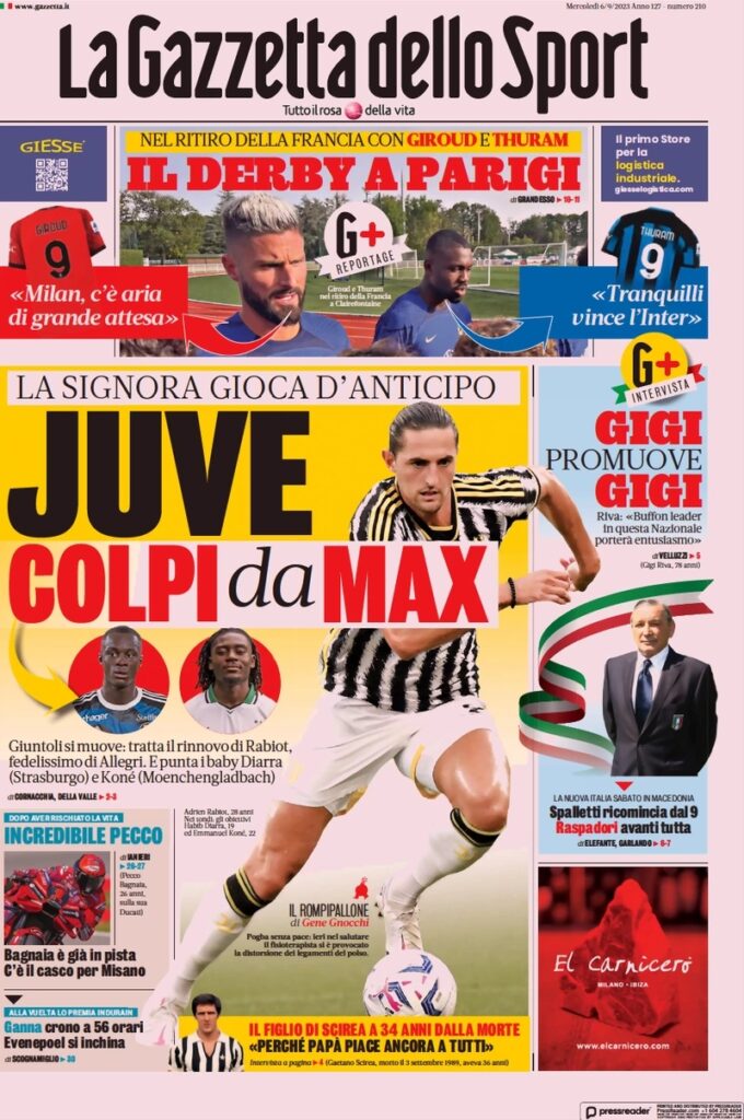 Nell’edizione odierna La Gazzetta dello Sport titola: “Juve, colpi da Max”. E poi ancora: “Giuntoli si muove: tratta il rinnovo di Rabiot, fedelissimo di Allegri. E punta i baby Diarra (Strasburgo) e Konè (Monchengladbach)”. A lato spazio anche alla nazionale: “Gigi promuove Gigi. Riva: Buffon leader in questa Nazionale, porterà entusiasmo”.