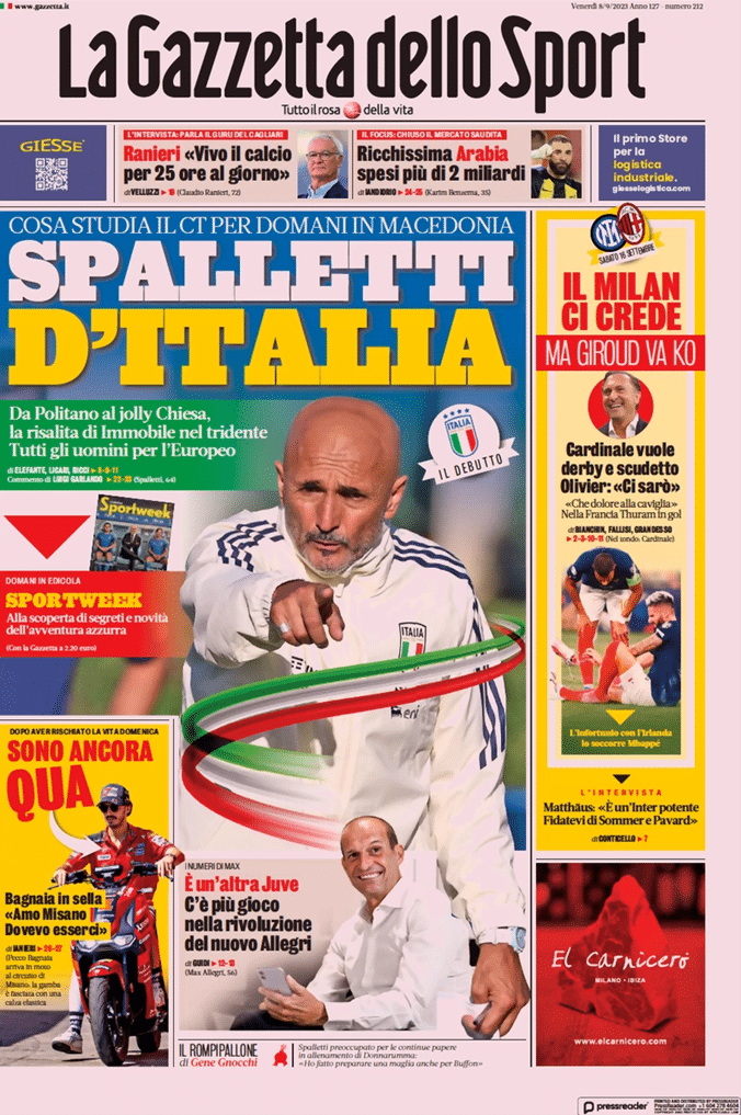 L’argomento della prima pagina de La Gazzetta dello Sport si incentra sull’impegno di domani degli Azzurri: “Spalletti d’Italia”. L’Inter fa il pieno”. In taglio basso spazio anche ai bianconeri: “I numeri di Max: è un’altra Juve, C’è più gioco nella rivoluzione del nuovo Allegri”.