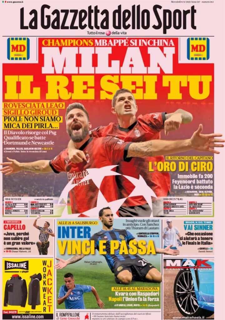 “Milan il re sei tu”, questo il titolo della prima pagina de La Gazzetta dello Sport. Il riferimento è alla vittoria dei rossoneri in Champions League contro il PSG. In taglio basso spazio anche alle sfide di questa sera: “Inter, vinci e passa”. A lato un’intervista esclusiva a Capello: “Juve, perchè non subire gol è un gran valore”.