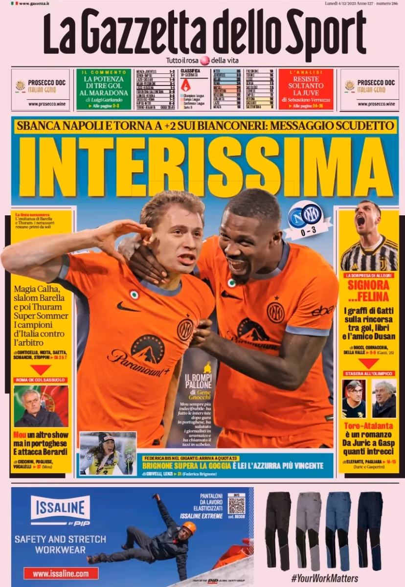 “Interissima”, questo il titolo della prima pagina de La Gazzetta dello Sport. Il riferimento è alla vittoria netta per 3-0 della squadra di Inzaghi sul Napoli. In taglio laterale: “Signora… Felina”. E ancora: “I graffi di Gatti sulla rincorsa tra gol, libri e l’amico Dusan”. Sulla Roma: “Mou, un altro show ma in portoghese. E attacca Berardi”.