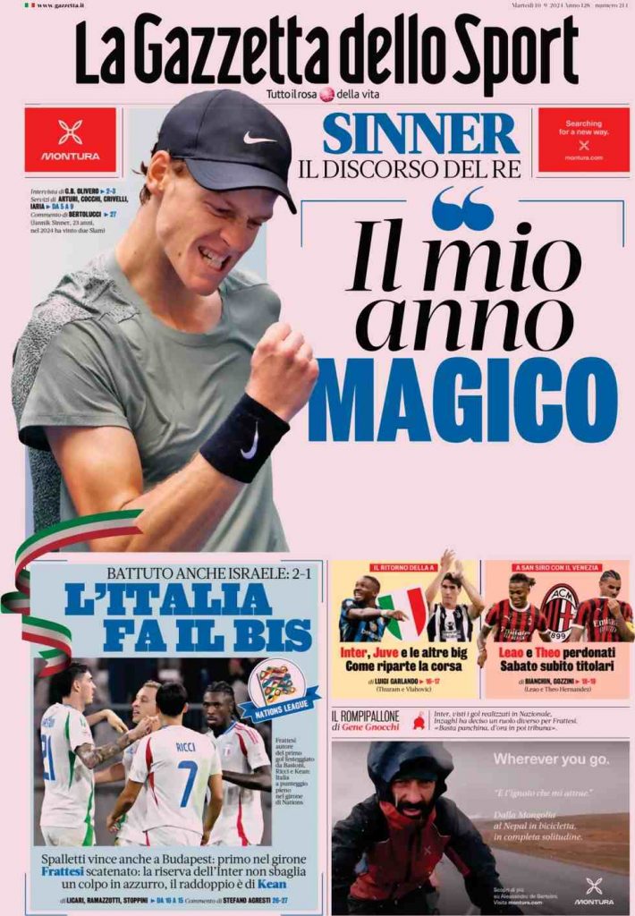 La Gazzetta dello Sport apre con il tennis e in particolar modo con Sinner: “Il mio amico magico”. In taglio basso spazio agli Azzurri di Spalletti: “L’Italia fa il bis”. A lato: “Inter, Juve e e le altre big. Come riparte la corsa” e “Leao e Theo perdonati. Sabato subito titolari”.