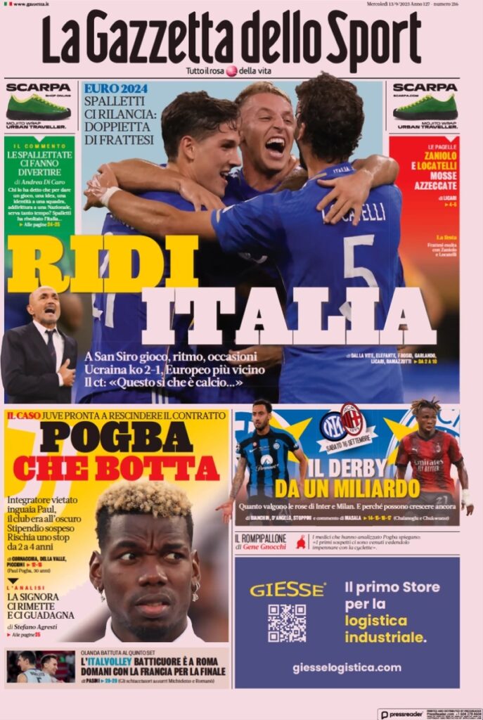 “Ridi Italia”, questo il titolo sulla prima pagina de La Gazzetta dello Sport. Grazie alla doppietta di Frattesi gli Azzurri hanno battuto 2-1 l’Ucraina e ora possono continuare a sperare nella qualificazione a Euro2024. In taglio basso spazio alla Juve: “Pogba che botta. Juve pronta a rescindere il contratto”.