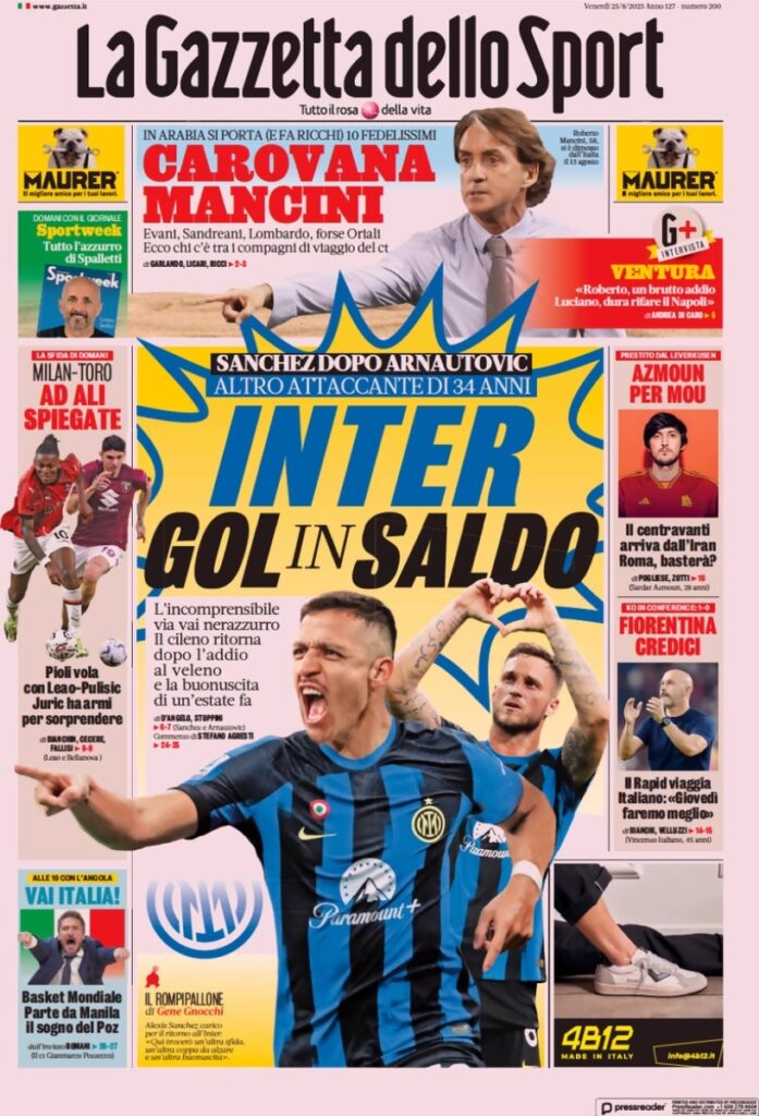La prima pagina de La Gazzetta dello Sport in edicola oggi è dedicata all’Inter: “Inter gol in saldo. Sanchez dopo Arnautovic, altro attaccante di 34 anni”. In taglio alto spazio a Mancini e all’offerta come nuovo ct dell’Arabia Saudita, mentre non ci sono aggiornamenti sulla Juve