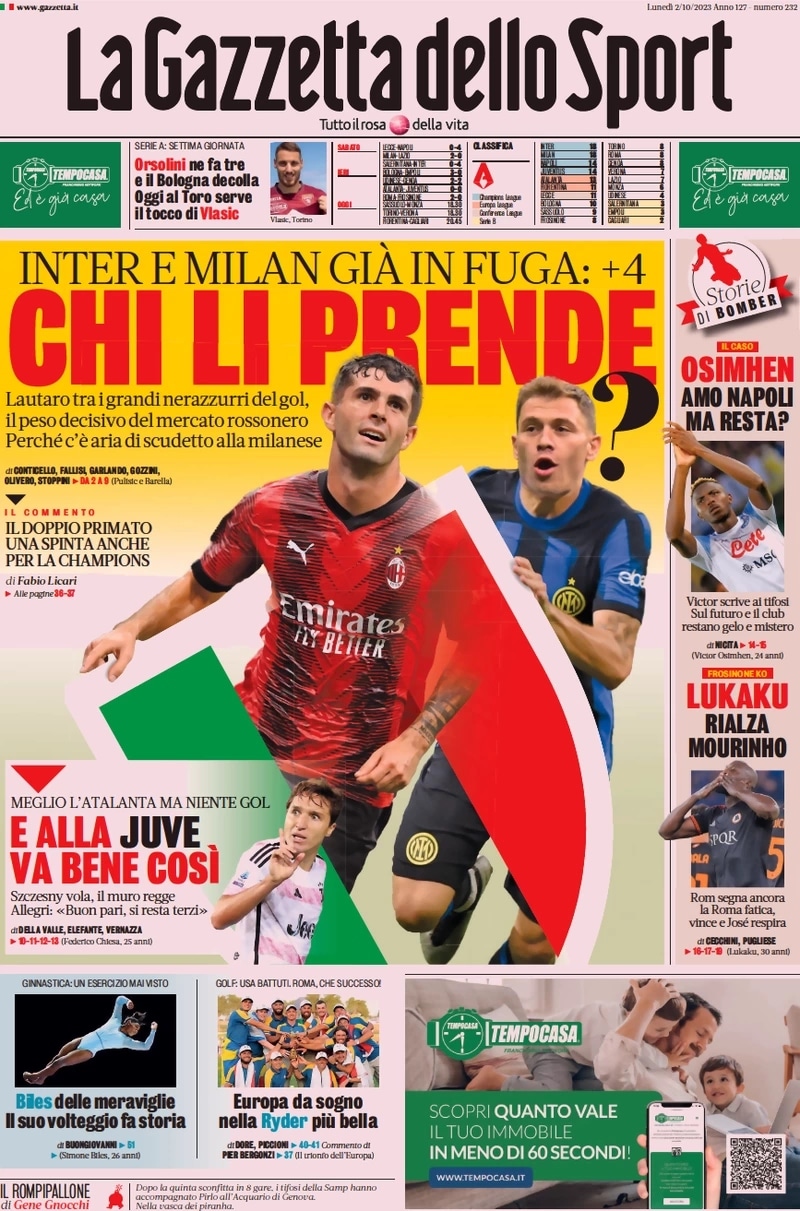 La Gazzetta dello Sport in edicola oggi apre con la fuga di Inter e Milan: “Chi li prende?”. Le due squadre di Milano sono già a +4 rispetto alle inseguitrici. In taglio basso spazio anche ai bianconeri: “Meglio l’Atalanta ma niente gol. E alla Juve va bene così“.