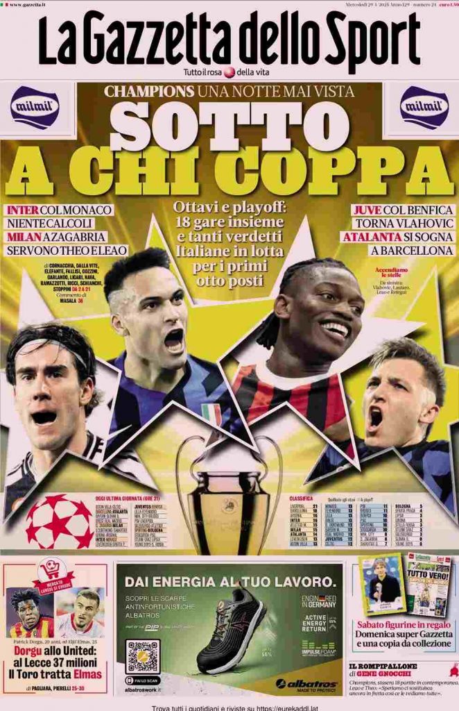 La Gazzetta dello Sport titola: “Sotto a chi coppa. Champions, una notte mai vista”. E ancora: “Inter col Monaco niente calcoli”, “Milan a Zagabria servono Theo e Leao”, “Juve col Benfica torna Vlahovic” e “Atalanta si sogna a Barcellona”. In basso: “Dorgu allo United: al Lecce 37 milioni. Il Toro tratta Elmas”.