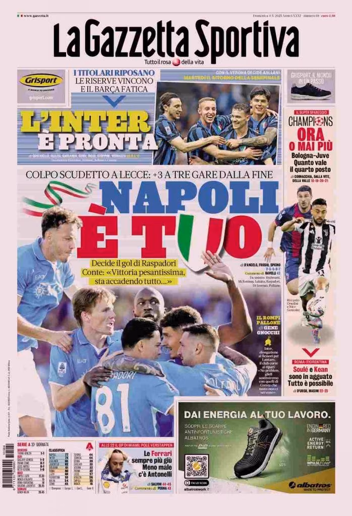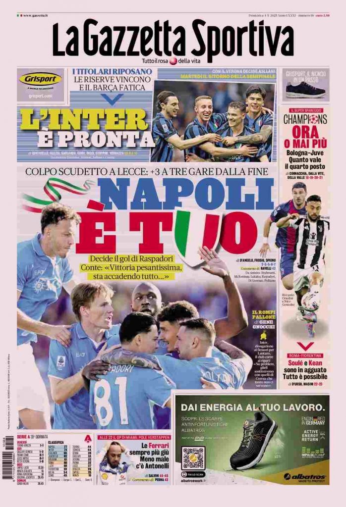 La Gazzetta dello Sport apre con la vittoria della squadra di Conte sul Lecce: “Napoli è tuo. Colpo scudetto a Lecce: +3 a tre gare dalla fine”. In alto: “L’Inter è pronta”. A lato: “Ora o mai più. Bologna-Juve. Quanto vale il quarto posto” e “Soulè e Kean sono in agguato. Tutto è possibile”. In basso: “Le Ferrari sempre più giù. Meno male c’è Antonelli”.