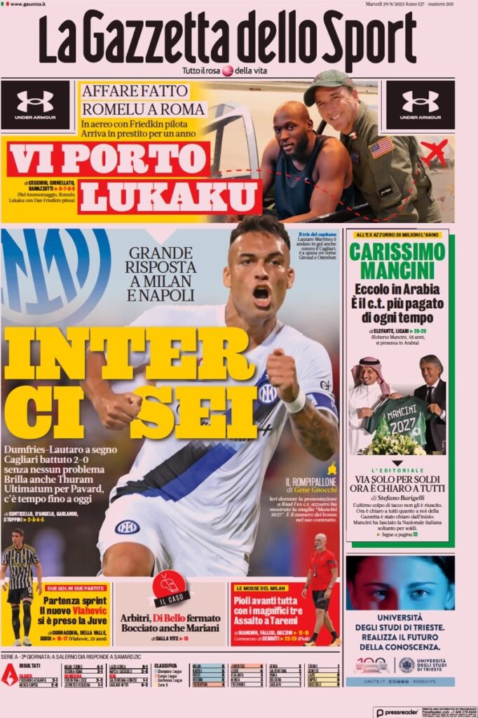 Il titolo sulla prima pagina del Corriere dello Sport è tutto per la Roma: “Gigantesco. La Roma ha preso Lukaku: straordinario colpo dei Friedkin“. E poi ancora: “Tifosi giallorossi in festa: oggi alle 17 il belga a Ciampiano con un aereo guidato dal presidente Dan”. Sul caso Iling-Ndoye: “Di Bello, stop di 2 mesi. L’arbitro di Juve-Bologna rientrerà dopo metà ottobre“.