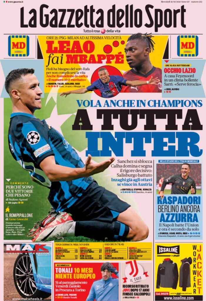 “A tutta Inter. Vola anche in Champions”, questo il titolo dell’edizione odierna de La Gazzetta dello Sport. In alto novità sul Milan: “Leao fai Mbappe”. In taglio basso: “Ricorso ritirato, Juve dopo 17 anni finisce Calciopoli“.
