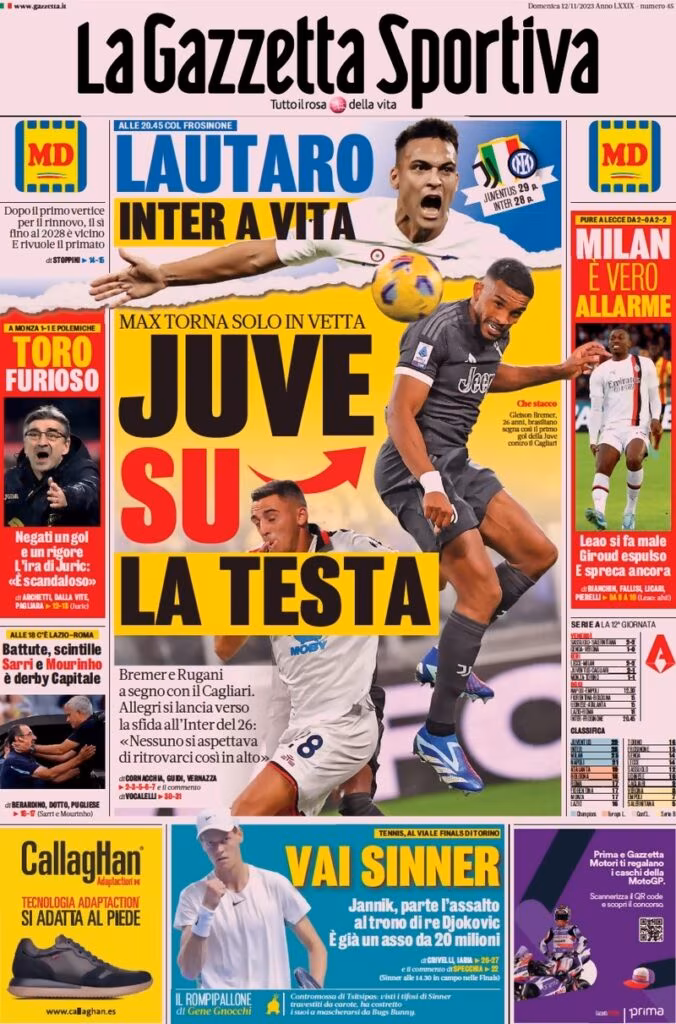 La Gazzetta dello Sport apre in prima pagina con la vittoria dei bianconeri: “Juve, su la testa”. E ancora: “Max torna solo in vetta”. In attesa dell’Inter, infatti, la squadra di Allegri è al momento prima in classifica. In taglio alto: “Lautaro, Inter a vita”. A lato novità sul Milan: “Milan, è vero allarme”.