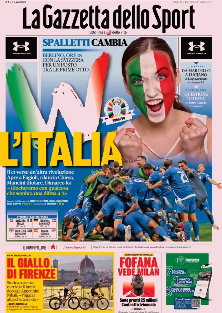 “W l’Italia”, questo è il titolo de La Gazzetta dello Sport. E ancora: “Spalletti cambia”. In taglio basso: “Fofana vede Milan”.