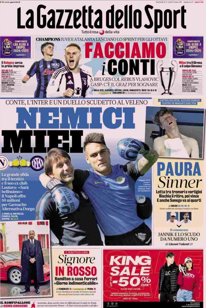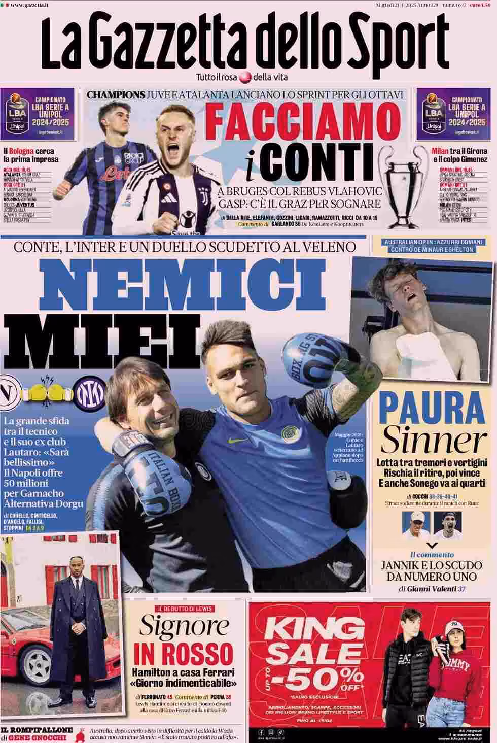 La Gazzetta dello Sport titola: “Nemici miei”. Il riferimento è alla lotta scudetto: “Conte, l’Inter e un duello scudetto al veleno”. In taglio alto spazio alla Champions League: “Facciamo i conti. A Bruges col rebus Vlahovic. Gasp, c’è il Ganz per sognare”. A lato: “Paura Sinner. Lotta tra tremori e vertigini. Rischia il ritiro, poi vince. E anche Sonego va ai quarti”. In basso: “Signore in rosso. Hamilton a casa Ferrari: Giorno indimenticabile”.