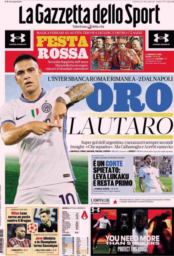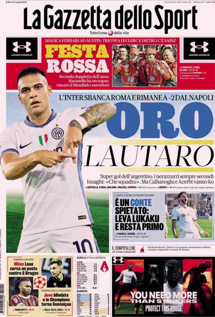 La Gazzetta dello Sport apre con la vittoria dell’Inter contro la Roma: “Oro Lautaro. L’Inter sbanca Roma e rimane a -2 dal Napoli”. Sotto: “È un Conte spietato: leva Lukaku e resta primo”. In taglio alto: “Festa rossa”. In basso spazio alla Champions League: “Milan, Leao cerca un posto contro il Bruges” e “Juve blindata e in Champions torna Conceicao“.