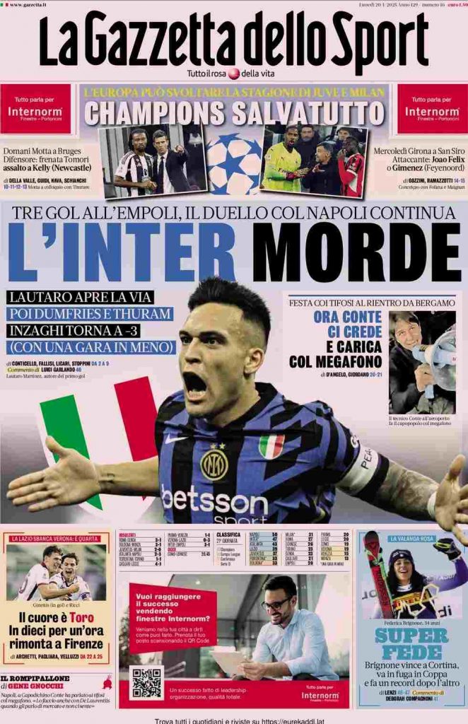Il Corriere dello Sport apre con la vittoria nerazzurra: “L’ombra dell’Inter. Lautaro risponde a Conte”. In taglio alto: “Napoli, l’all in di DeLa”. In taglio basso: “Juve, soluzione Kelly. Giuntoli pensa al centrale del Newcastle”, “Sorpasso Ancelotti: Real primo. Doppio Mbappe” e “Brignone l’altra regina di Cortina”.
