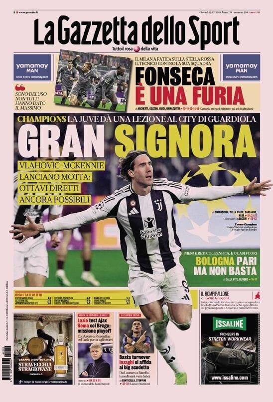 La Gazzetta dello Sport apre con la vittoria della Juve sul Manchester City in Champions League: “Gran Signora”. E ancora: “Vlahovic e McKennie lanciano Motta: ottavi diretti ancora possibili”. In taglio alto: “Fonseca è una furia”. E ancora: “Il Milan fatica sulla Stella Rossa. Il tecnico contro la sua squadra”. In basso: “Bologna, pari ma non basta”, “Lazio test Ajax. Roma col Braga: missione playoff” e “Basta turnover. Inzaghi si affida ai big scudetto”.