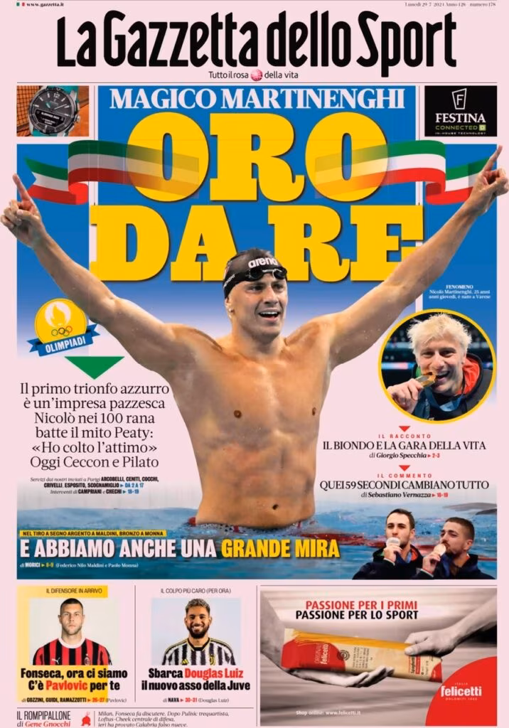 La Gazzetta dello Sport apre con le Olimpiadi: “Oro da re” In taglio basso: “Fonseca, ora ci siamo. C’è Pavlovic per te” e “Sbarca Douglas Luiz. Il nuovo asso della Juve“.