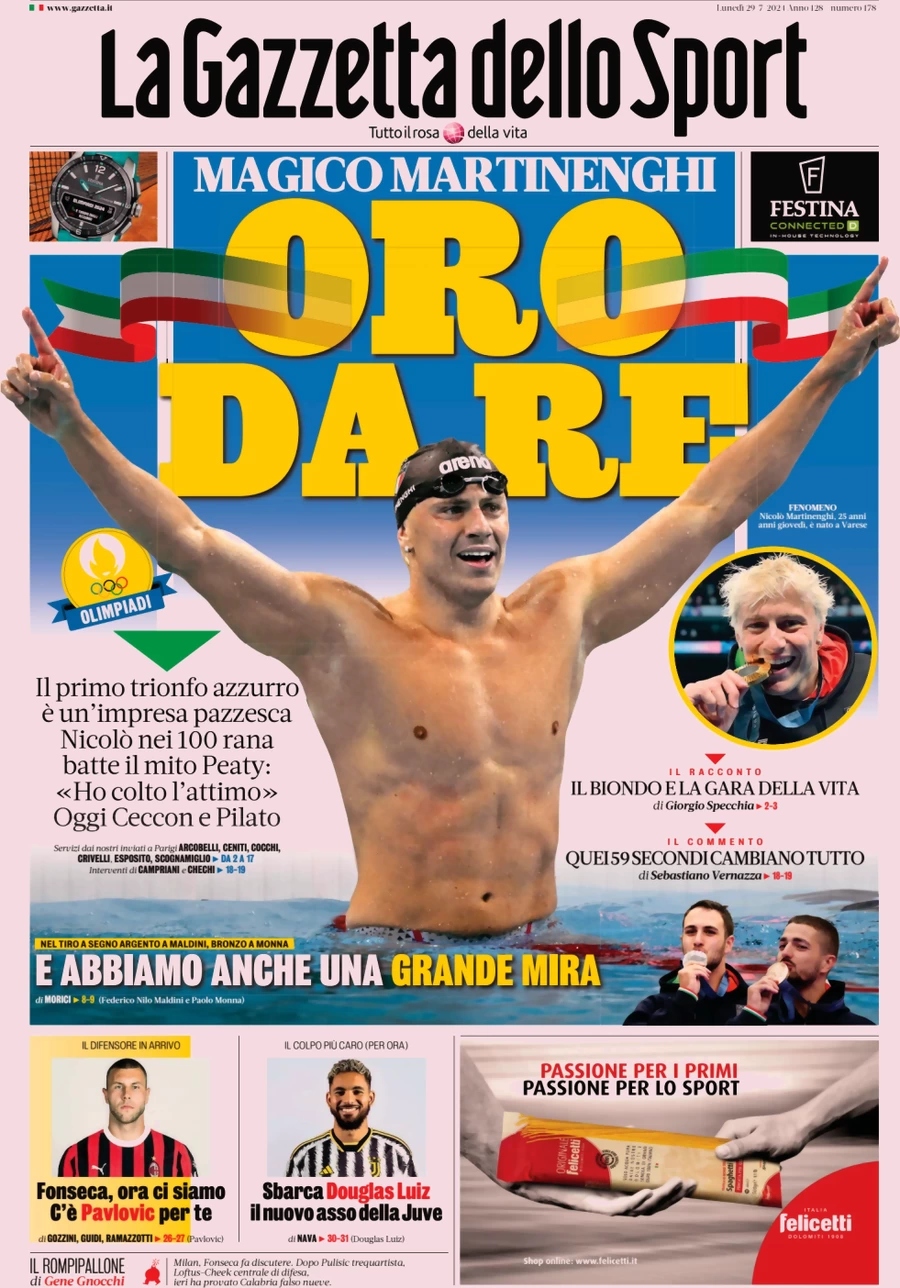 La Gazzetta dello Sport apre con le Olimpiadi: “Oro da re” In taglio basso: “Fonseca, ora ci siamo. C’è Pavlovic per te” e “Sbarca Douglas Luiz. Il nuovo asso della Juve“.