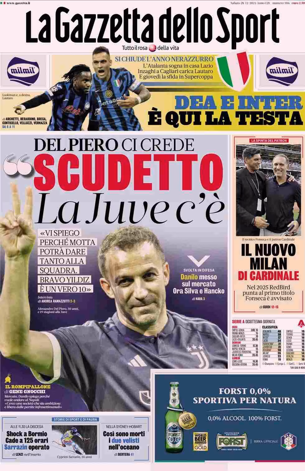 La Gazzetta dello Sport apre con le parole della leggenda bianconera per eccellenza: “Del Piero ci crede: Scudetto. La Juve c’è”. E ancora: “Vi spiego perchè Motta potrà dare tanto alla squadra. Bravo Yildiz, è un vero 10″. E poi: “Danilo messo sul mercato. Ora Silva e Hancko“. In taglio alto: “Dea e Inter, è qui la testa”. A lato: “Il nuovo Milan di Cardinale”.