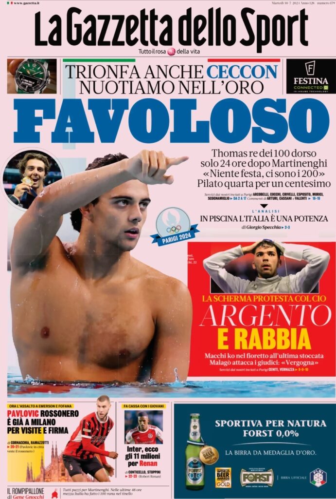 La Gazzetta dello Sport apre con la vittoria di Ceccon alle Olimpiadi: “Favoloso”. Sulla scherma: “Argento e rabbia”. In taglio basso: “Pavlovic rossonero è già a Milano per visite e firma” e “Inter, ecco gli 11 milioni per Renan”.