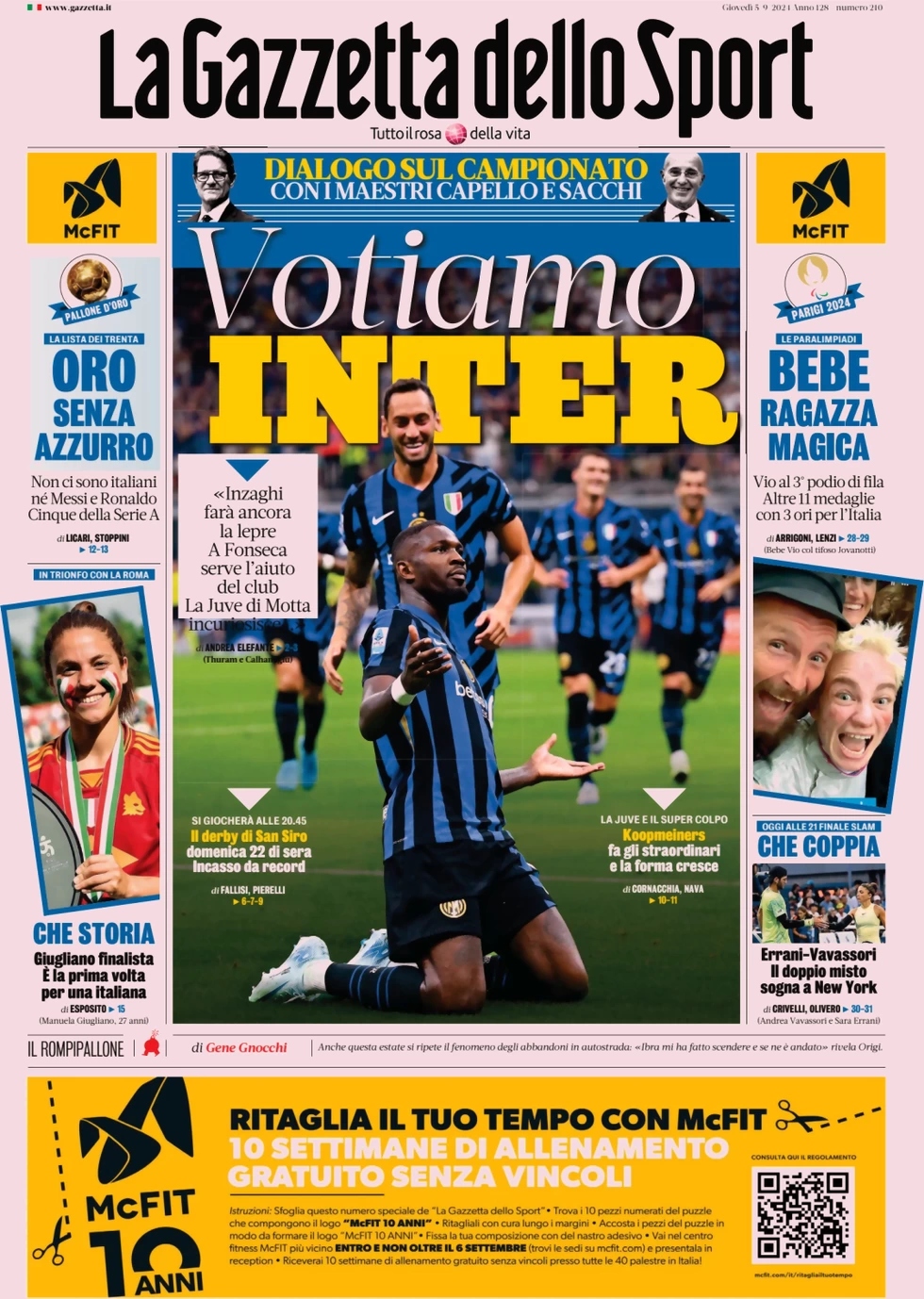 La Gazzetta dello Sport apre con i commenti di Capello e Sacchi sulla vittoria del campionato: “Votiamo Inter”. A lato spazio alle Paraolimpiadi: “Bebe ragazza magica”. Sulla lista per il Pallone d’Oro: “Oro senza Azzurro”. Ma c’è invece per quello femminile: “Che storia. Giugliano finalista. È la prima volta per un’italiana“. Sul tennis: “Errani-Vavassori. Il doppio misto sogna a New York”.