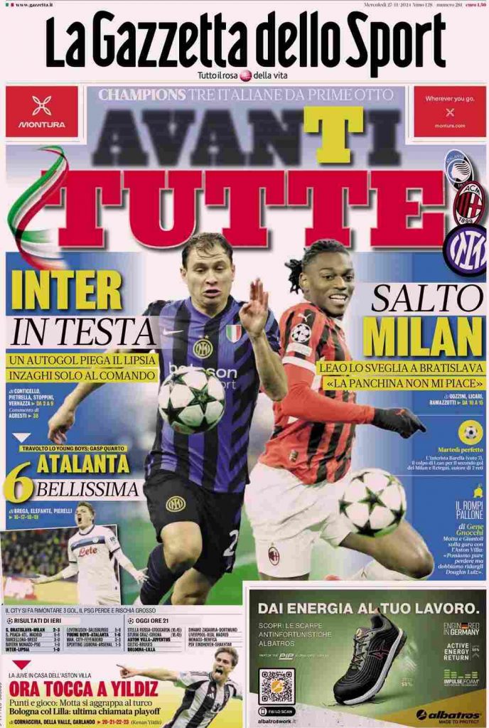 La Gazzetta dello Sport apre con la classifica aggiornata della nuova Champions: “Avanti tutTe. Champions, tre italiane da prime otto”. E ancora: “Inter in testa. Un autogol piega il Lipsia. Inzaghi solo al comando”, “Salto Milan. Leao lo sveglia a Bratislava: La panchina non mi piace” e “Atalanta 6 bellissima. Travolto lo Young Boys: Gasp quarto”. In taglio basso: “Ora tocca a Yildiz. Punti e gioco: Motta si aggrappa al turco. Bologna col Lilla: ultima chiamata playoff”.