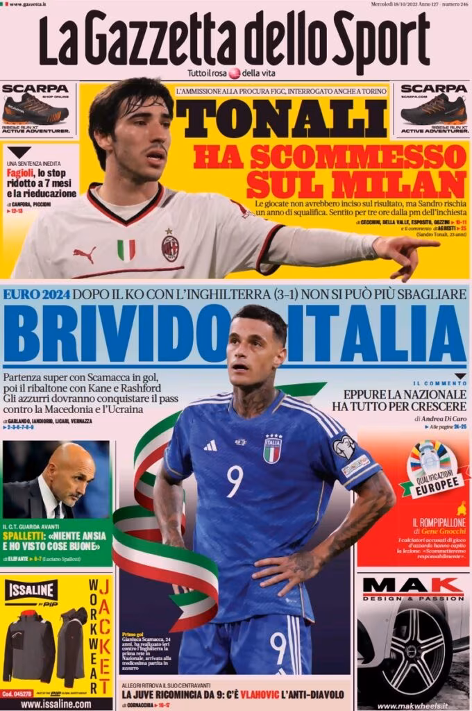 La Gazzetta dello Sport apre in prima pagina con la sconfitta per 3-1 contro l’Inghilterra: “Brivido Italia“. Ora gli Azzurri non potranno più sbagliare. In taglio alto novità anche sul caso scommesse: “Tonali ha scommesso sul Milan”. E ancora: “Fagioli, lo stop ridotto a 7 mesi e la rieducazione“.