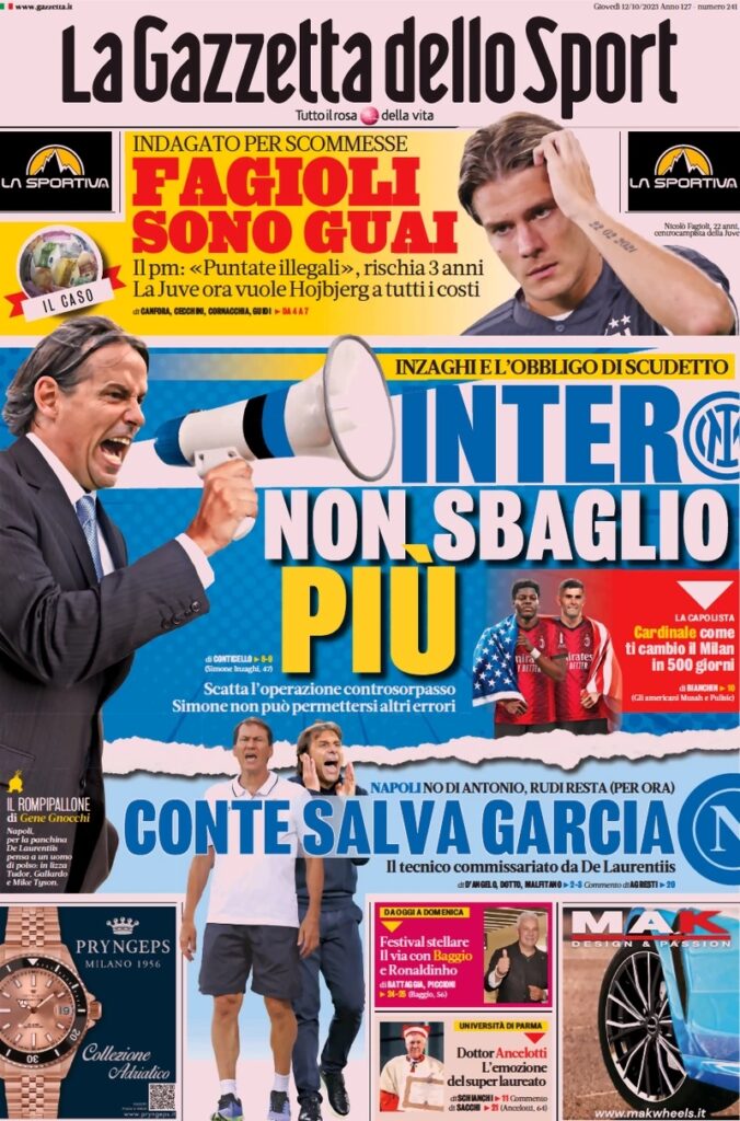 Il titolo della prima pagina de La Gazzetta dello Sport è sull’Inter: “Inter, non sbaglio più”. Il riferimento è Inzaghi, chiamato a vincere per puntare allo scudetto. In taglio alto spazio alla Juve: “Fagioli sono guai. Indagato per scommesse”. In basso novità sul Napoli: “Conte salva Garcia”.