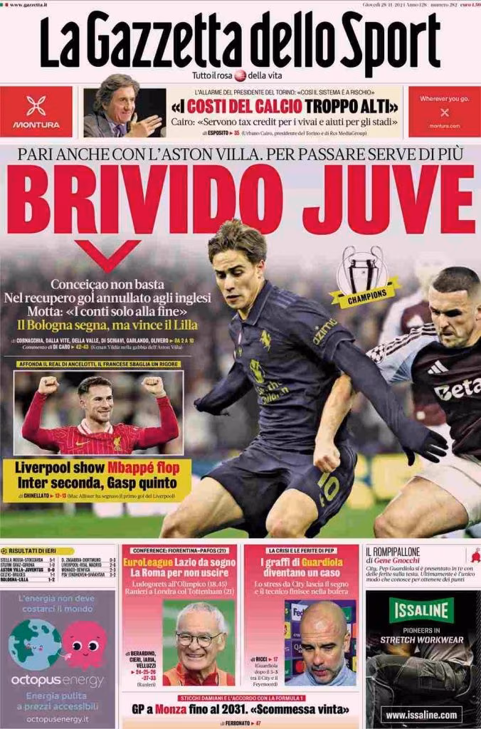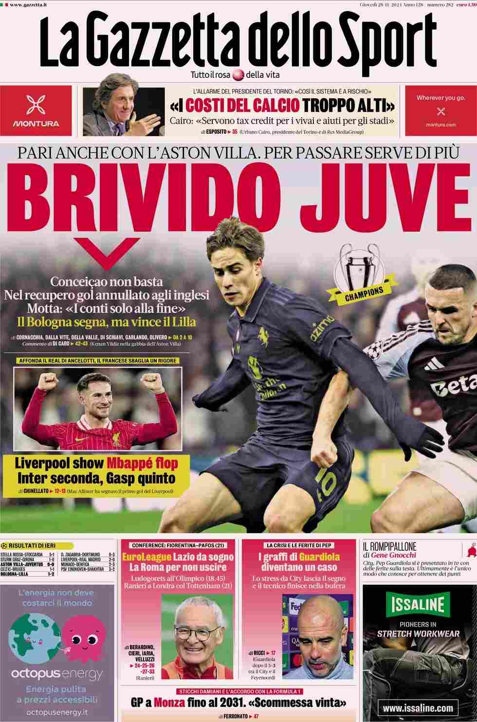 La Gazzetta dello Sport apre con il match di Champions League della squadra di Thiago Motta: “Brivido Juve”. E ancora: “Pari anche con l’Aston Villa, per passare serve di più”. Sotto: “Liverpool show, Mbappe flop. Inter seconda, Gasp quinto”. In taglio alto le parole di Cairo: “I costi del calcio troppo alti”. In basso: “Europa League. Lazio da sogno. La Roma per non uscire”, “I graffi di Guardiola diventano un caso” e “GP a Monza fino al 2031. Scommessa vinta”.