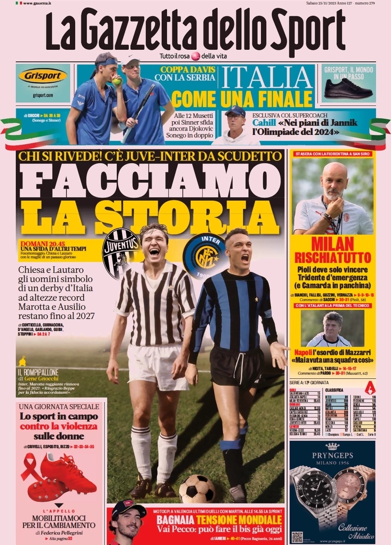 La prima pagina de La Gazzetta dello Sport è dedicata al derby d’Italia: “Facciamo la storia”. E ancora: “Chiesa e Lautaro gli uomini simbolo di un derby d’Italia ad altezze record. Marotta e Ausilio restano fino al 2027”. A lato: “Milan rischiatutto” e “Napoli, l’esordio di Mazzarri: Mai avuta una squadra così”.